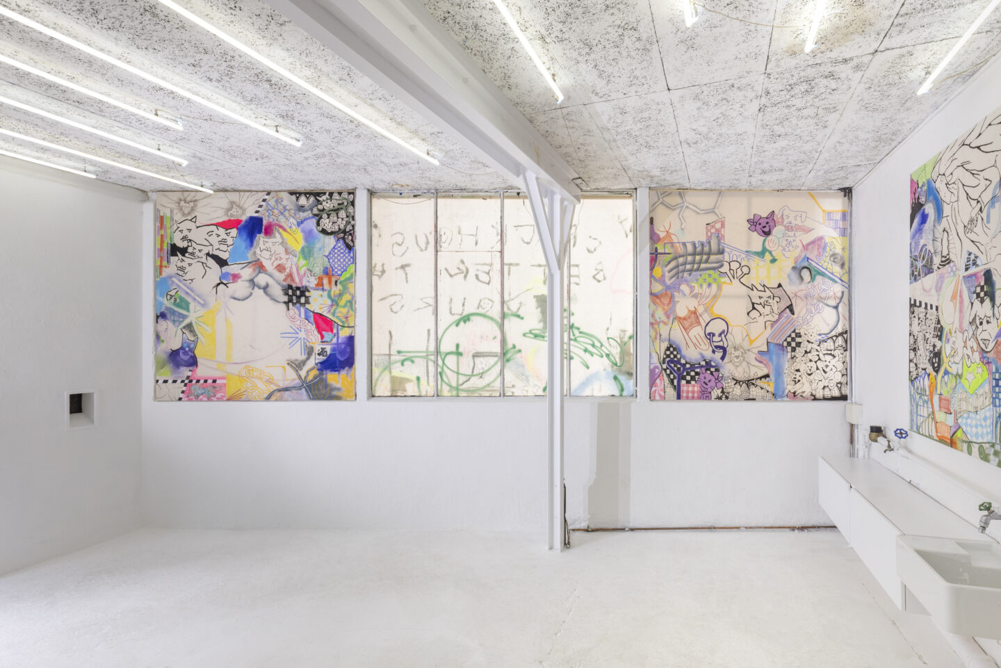 Fraîchement diplômé de la HEAD, l’artiste genevois Finn Massie fait cohabiter dans ses toiles des figures imaginaires et des personnages issus de la culture populaire. Dans une semi-improvisation, il recouvre la toile de motifs figuratifs esquissés à la peinture à l’huile, à l’acrylique, au pastel gras et sec, le tout agrémenté de pigments. Dans une saturation de formes, l’artiste compose l’espace en zones couleur saturée, voire fluorescente, ponctuées de dessins au trait apportant une respiration au tableau. On se trouve face à une déferlante d’images tout droit sortie de l’esprit de l’artiste, qui auraient pu être issues de l’agrandissement d’un carnet de recherche. On pourrait même avancer qu’il s’agisse du même type de dessins qui recouvraient les cahiers des artistes qui s’ennuyaient à l’école. Telle une écriture automatique, on se retrouve face à une certaine expression du subconscient. Dans une même œuvre, il intègre des éléments faisant référence à l’histoire de l’art, comme des fragments de cathédrales, puis divisant la surface de la toile, des smileys ou autres artéfacts de la culture du divertissement. Des animaux anthropomorphes évoquent les comics qu’affectionnent tout particulièrement les jeunes générations. L’artiste a été présenté pour la première fois en 2023 à la galerie Analix Forever dans le cadre de l’exposition Forever Young – drawing initiée par l’artiste professeur à la HEAD Pascal Berthoud. L’année suivante, il obtient son Bachelor en Arts Visuels. Finn Massie est désormais représenté par la galerie Kissed Then Burned fondée par Anne Minazio. En 2025, il y a présenté un solo show intitulé My Crack House is Better than Yours, un titre reflétant l’aspect psychédélique de l’artiste.