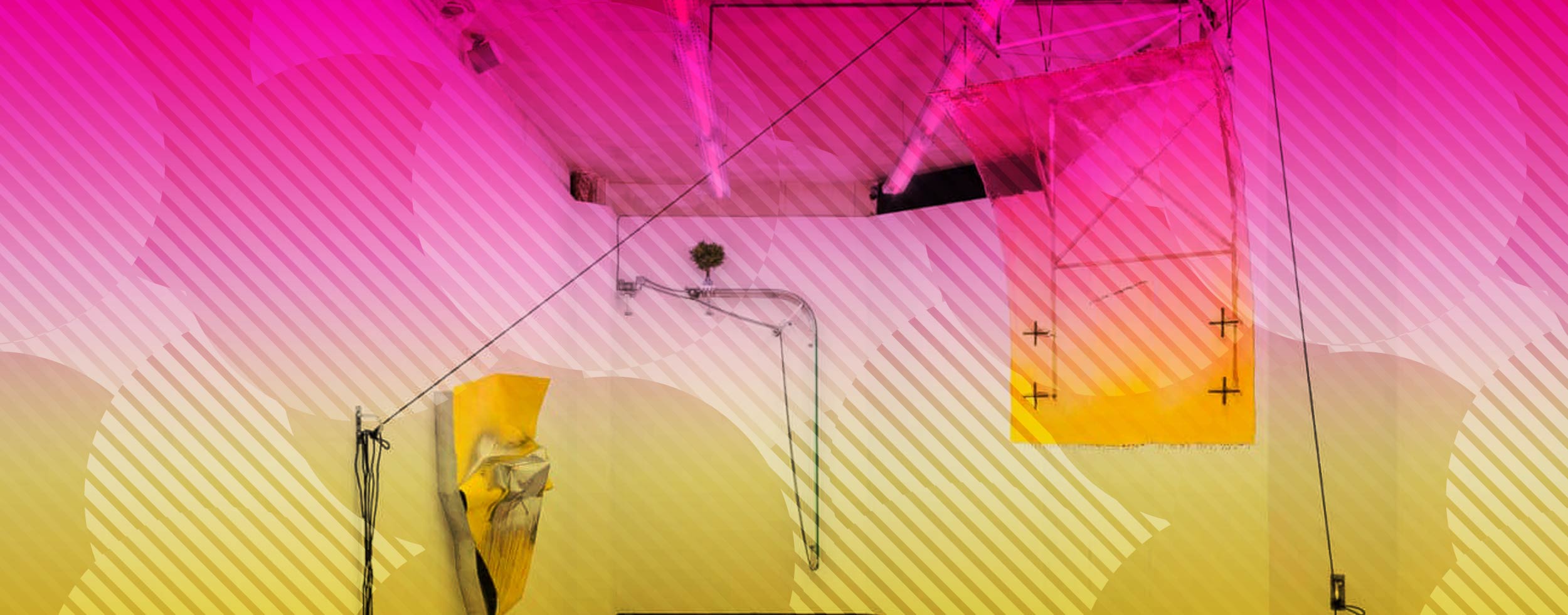 L’envers du décor Evoquant le rideau d’une scène de théâtre futuriste, une plaque curviligne de résine naturelle sied au dessus de nous. Ses tons évoquent un couché de soleil. Retenu par une poulie, ce ciel de résine surplombe l’ensemble des installations, plantant ainsi le décor. On aperçoit à travers le verre artificiel la structure métallique de l’oeuvre rappelant également l’environnement urbain dans lequel nous évoluons chaque jour. Le dégradé régulier entre le jaune et le fuchsia témoigne d’une maîtrise parfaite de la matière par l’artiste. On pourrait presque penser qu’il s’agit d’une production industrielle. En effet, chez Dorian Gaudin, le thème de la production industrielle – représenté notamment par des chaînes de montage – est récurrent dans ses installations.