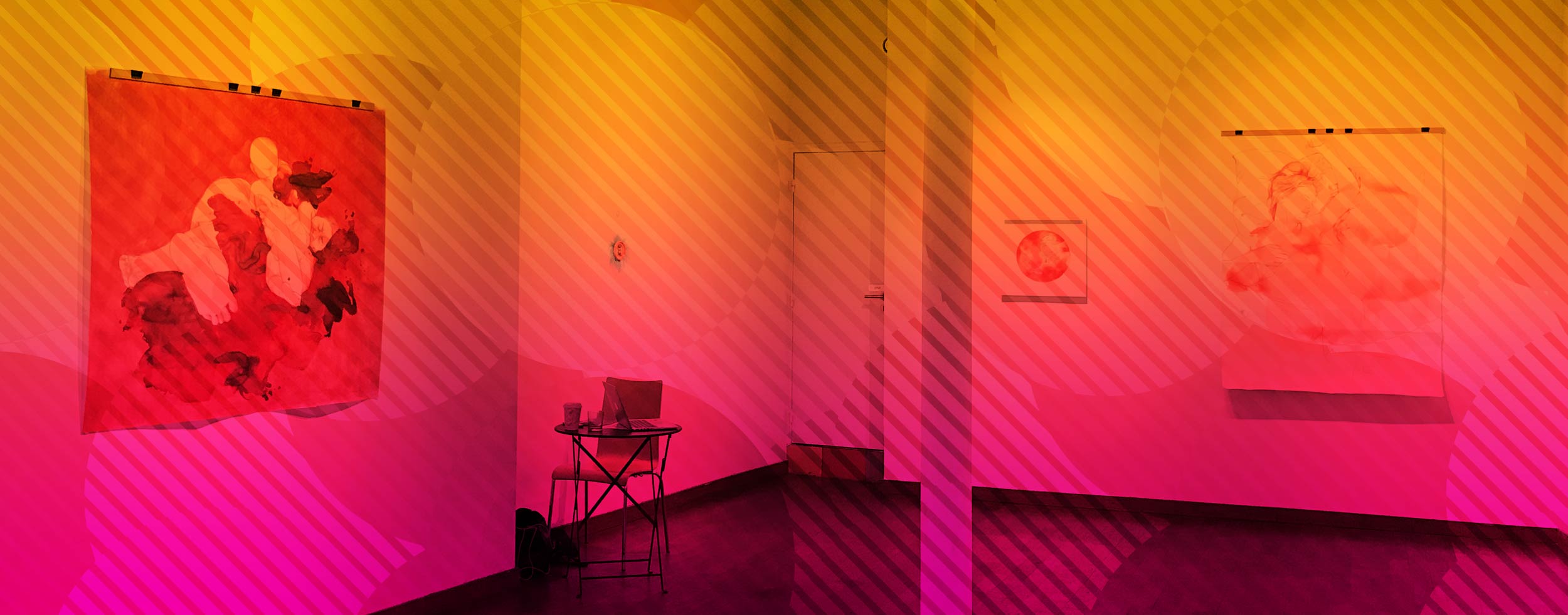 Vivons heureux, vivons cachés! L’exposition Taking a chance on love déborde de douceur et de sensualité. Dans des tonalités chaudes, parfois acidulées, on pénètre dans la vie sentimentale de l’artiste. Le thème de ses derniers travaux sont à la fois intimes et libérateurs. Il tourne essentiellement autour de la féminité et du désir. Mariée à un finlandais suédophone, elle vit actuellement à Helsinki mais n’en oublie pas ses racines orientales. Dans son pays natal, son travail plus académique est d’ailleurs très apprécié. Pour preuve, Liberty (2017), un dessin monumental, fait partie des meubles de l’ambassade du Bahreïn à Paris, un clin d’œil à Delacroix, où la Marianne est personnifiée par l’artiste. Contrairement à d’autre artistes, elle n’est ni dans la confrontation, ni dans la provocation. Sa culture fait profondément partie d’elle et elle souhaite atteindre une harmonie entre les traditions et la vie moderne. Elle souhaite vivre avec son temps et approfondir sa pratique artistique en adéquation avec ses origines. Une question tout à fait actuelle dans le monde oriental d’aujourd’hui. C’est pour cela qu’elle choisit d’exposer ses œuvres touchant le plus à l’intimité uniquement en Europe.