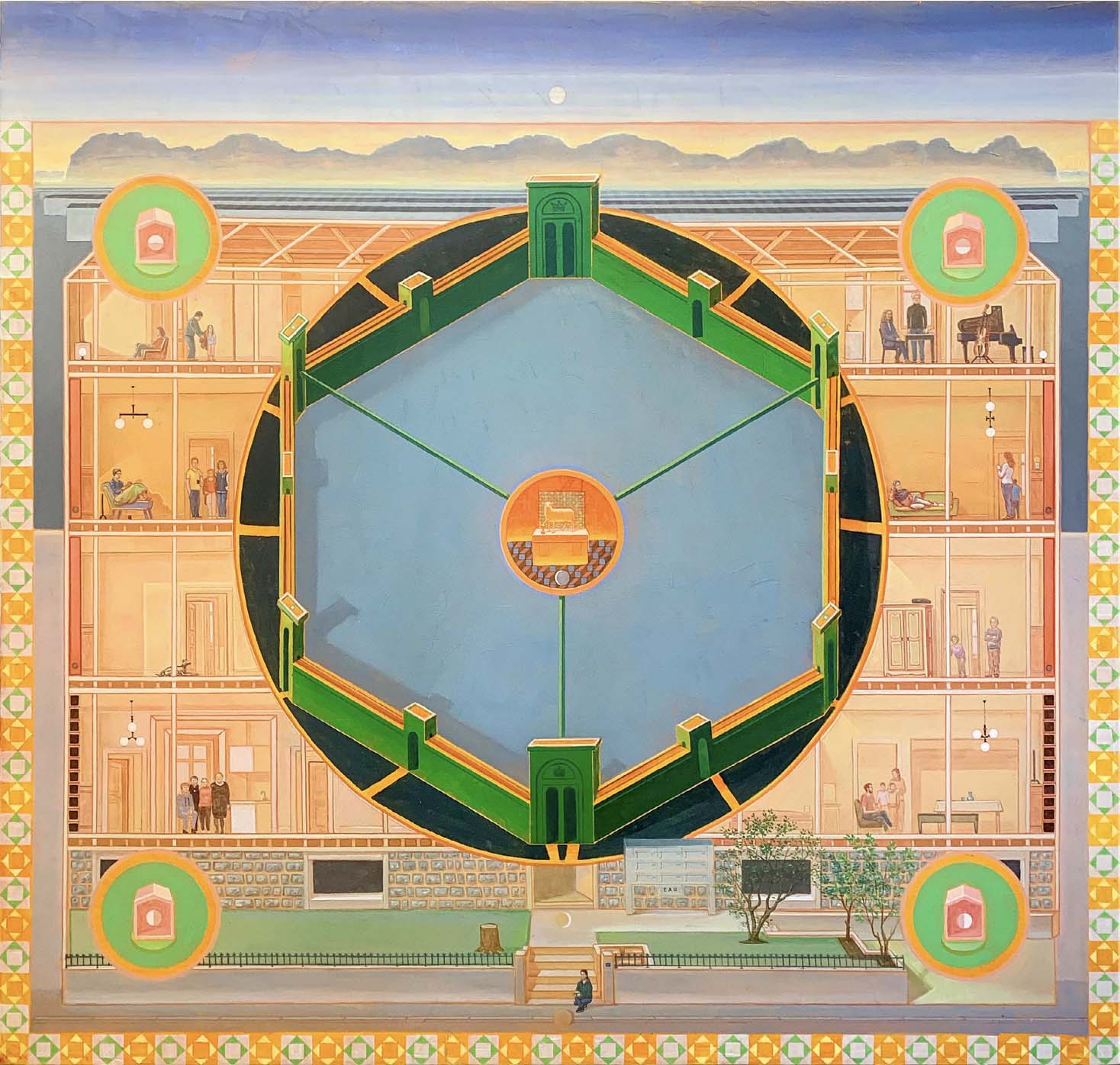 Les œuvres de l’artiste genevois Philippe Fretz semblent ouvrir le débat sur le vivre-ensemble. La notion de soin se ressent dans son œuvre de manière moins frontale. Chez lui, elle se personnifierait plutôt par la cohabitation. Dans Jérusalem verte (2024), il a représenté son immeuble, sans sa façade extérieure, de façon à laisser apparaître les cloisons séparant les appartements de ses voisins. Au centre de la toile, un hexagone capte l’attention ; il s’insère de manière répétitive dans les œuvres de l’artiste. Cette forme géométrique représente la nouvelle Jérusalem descendant du ciel selon l’Apocalypse, une cité à la forme carrée. Philippe Fretz trouvait que cela pouvait paraître austère, alors il a décidé de la représenter comme un cube vu de manière axonométrique. En effet, l’artiste aime jouer avec les formes et les surfaces.