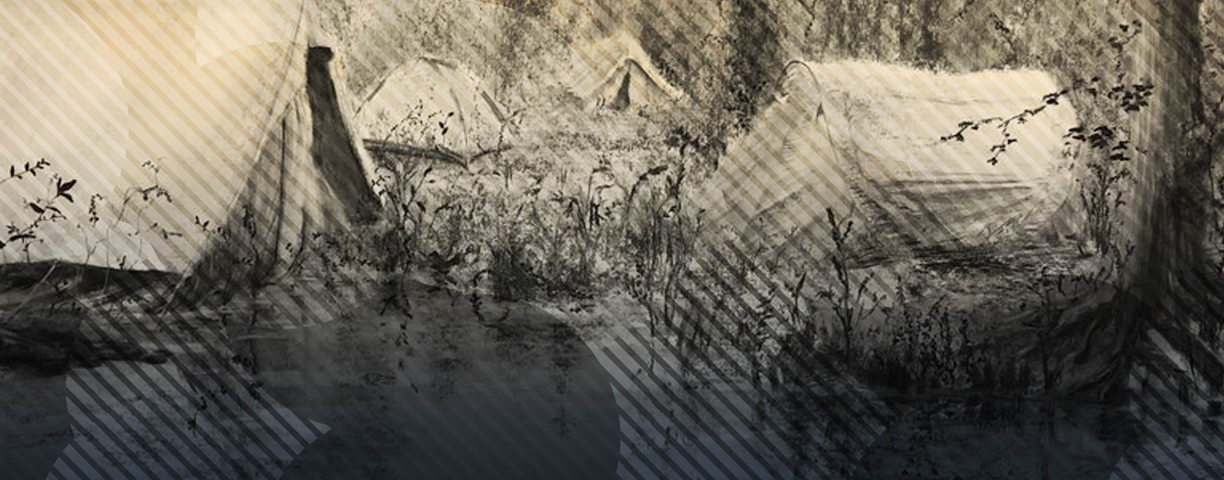 Dans Edgeland (2019), un dessin monumental long de 5 mètres, se déroule une scène aux dimensions inquiétantes dans un paysage sylvestre. Entre des arbres, on distingue des tentes éclairées par des guirlandes d’ampoules suspendues à des perches immergées dans l’eau s’approchant dangereusement de ce lieu de vie. Cet éclairage, dont l’usage habituel serait plutôt festif, souligne les plis des étoffes de ces abris de fortune et accentuent encore plus le côté irréel de la scène. L’artiste, habituée à dessiner des chapiteaux, a substitué ces derniers par des tentes. Appartiennent-elles à de migrants ou des personnes sans domicile fixe? Au loin, des personnages sur des échasses se confondent aux arbres. Ils semblent s’élever au-dessus des eaux, fuyant ainsi l’inondation. Sont-ce les survivants d’un naufrage économique ou politique? Ces personnages sans visage ni genre nous donnent l’impression d’appartenir à une autre réalité. On retrouve ces éléments dans la plupart des oeuvres de l’artiste, évoluant dans un décor emprunt de mystère. Parfois agrémentés d’une touche de couleur, ils dégagent néanmoins une certaine mélancolie.